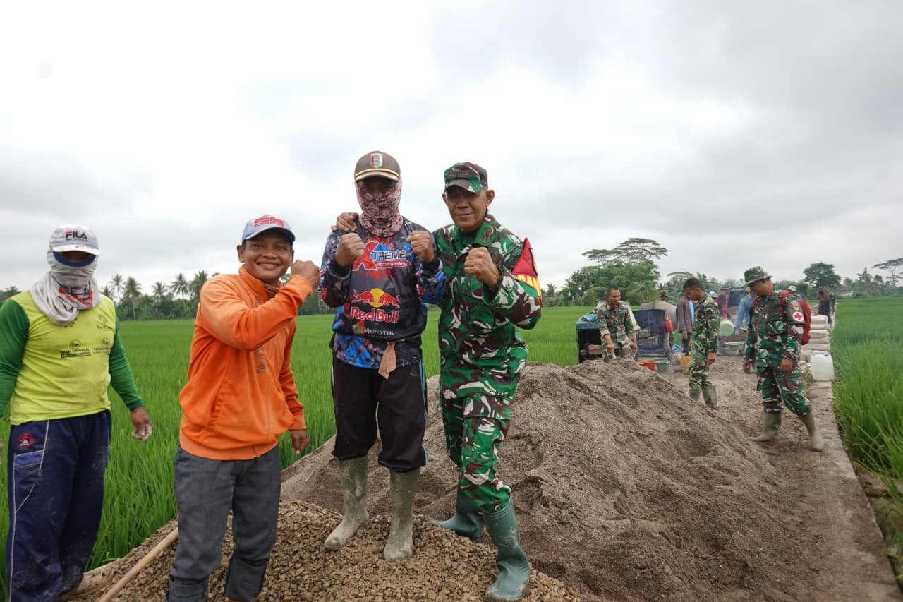 Kehadiran Dan SSK di lokasi turut memotivasi prajurit dan warga yang terlibat. Semangat gotong royong semakin terlihat saat adukan semen diangkut menggunakan angkong dan diratakan bersama-sama.