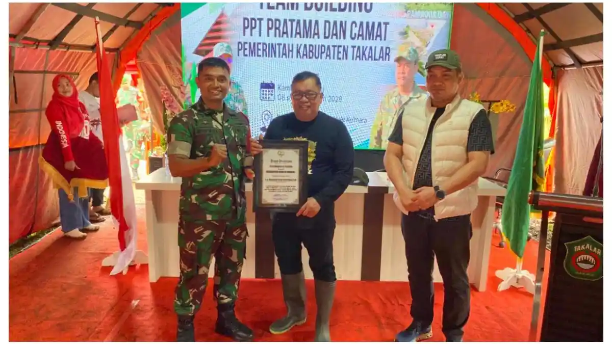 Komandan Kodim (Dandim) 1426/Takalar, Letkol Inf Anton Timotius Milala, menyerahkan piagam penghargaan dari Komando Resor Militer (Korem) 141/Toddopuli kepada Bupati Takalar, Mohammad Firdaus Daeng Manye, pada penutupan kegiatan team building pejabat pimpinan tinggi pratama dan camat di Dusun Kupanga, Desa Kale Ko’mara, Kecamatan Polongbangkeng Timur, Kabupaten Takalar, Sulawesi Selatan, Sabtu (10/1/2026).