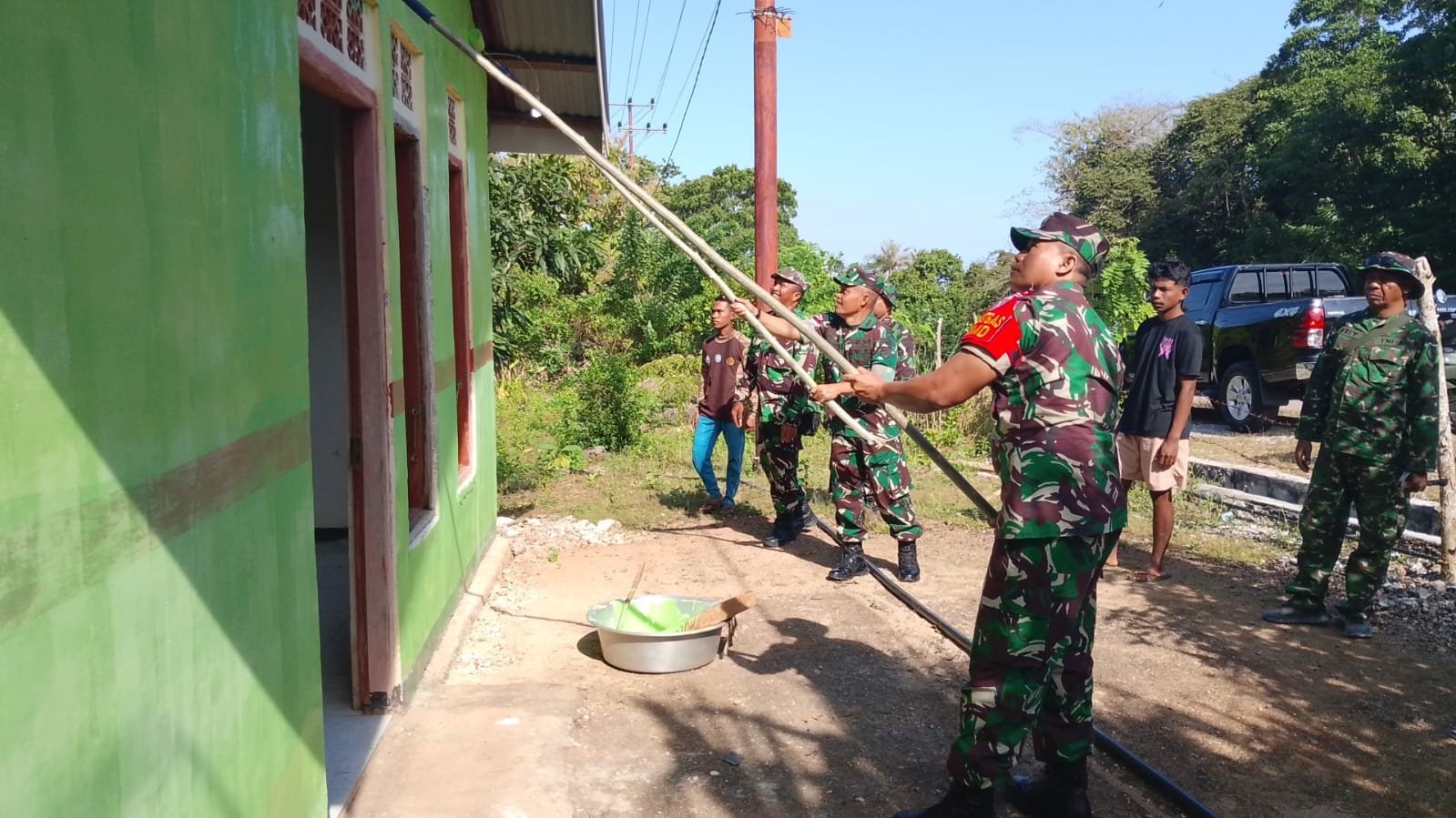 Komandan Kodim 1604/Kupang, Kolonel Inf Kadek Abriawan, S.I.P., M.H.I., menunjukkan kepeduliannya terhadap masyarakat dengan turun langsung ke lokasi TNI Manunggal Membangun Desa (TMMD) ke-124 di Desa Huilelot, Kecamatan Semau, Kabupaten Kupang. Didampingi Pasiterdim Mayor Inf Sudirman, Pgs. Danramil 06/Batakte Letda Inf Alexander Mahoklory, dan Batiter Peltu Daswaji, Dandim ikut serta dalam proses pengecatan rumah tidak layak huni milik Bapak Agustinus Tapatab, salah satu warga setempat.