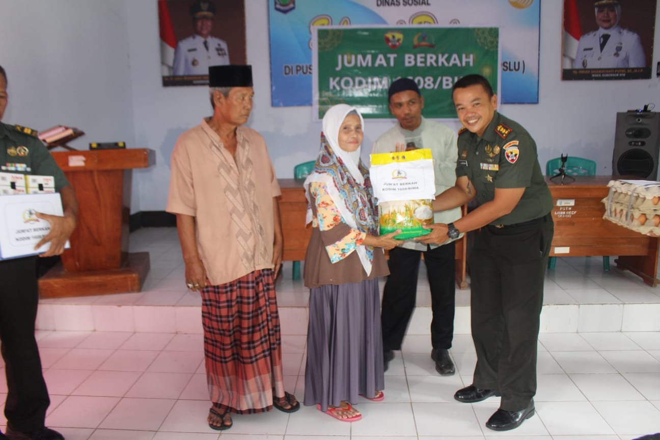 Dandim 1608/Bima dalam sambutannya menyampaikan Puji syukur ke hadirat Tuhan Yang Maha Esa, pada hari Jumat yang penuh berkah ini kami dapat bersilaturahmi sekaligus berbagi melalui kegiatan Jumat Berkah berupa pemberian sembako. Kegiatan ini merupakan wujud kepedulian Kodim 1608/Bima kepada para orang tua yang membutuhkan perhatian dan kasih sayang kita bersama. “Kami berharap bantuan ini dapat bermanfaat dan meringankan kebutuhan sehari-hari, serta kehadiran kami dapat membawa kebahagiaan dan semangat bagi para lansia,”ucap Dandim.