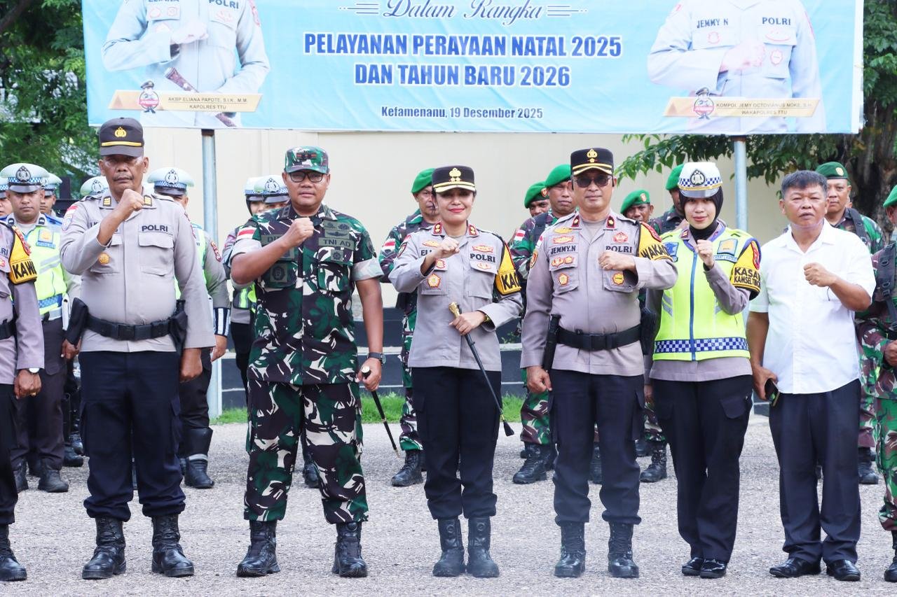 NTT–Kefamenanu., Sebagai bentuk nyata sinergitas TNI–Polri di Kabupaten Timor Tengah Utara, Rabu, 24 Desember 2025, bertempat di Lapangan Mapolres TTU, Jalan Prof. Dr. W.Z. Yohanes, Kelurahan Kefamenanu Tengah, Kecamatan Kota Kefamenanu, Kabupaten TTU, Komandan Kodim 1618/TTU Letkol Arm Didit Prasetyo Purwanto, S.E., bersama Kapolres TTU AKBP Eliana Papote, S.I.K., M.M., memimpin langsung Apel Gelar Pasukan dan pengecekan kesiapan pengamanan VVIP serta pengamanan Natal dan Tahun Baru (Nataru). Apel tersebut diikuti oleh personel Kodim 1618/TTU dan personel Polres TTU.