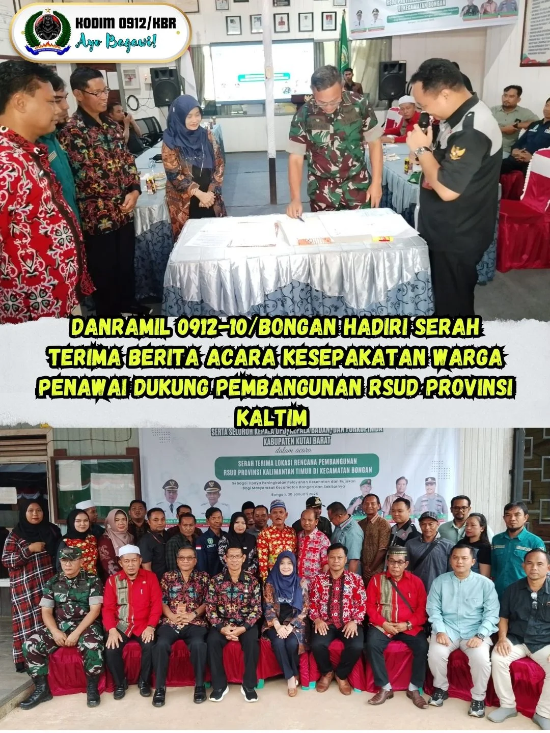 Kutai Barat – Danramil 0912-10/Bongan Kapten Inf Hariyadi menghadiri kegiatan Serah Terima Berita Acara Kesepakatan Warga Kampung Penawai terkait rencana pembangunan RSUD Provinsi Kalimantan Timur di Kecamatan Bongan, yang dilaksanakan pada Jumat (30/01/2026) pukul 09.00 WITA bertempat di Kantor Kepala Kampung Penawai.