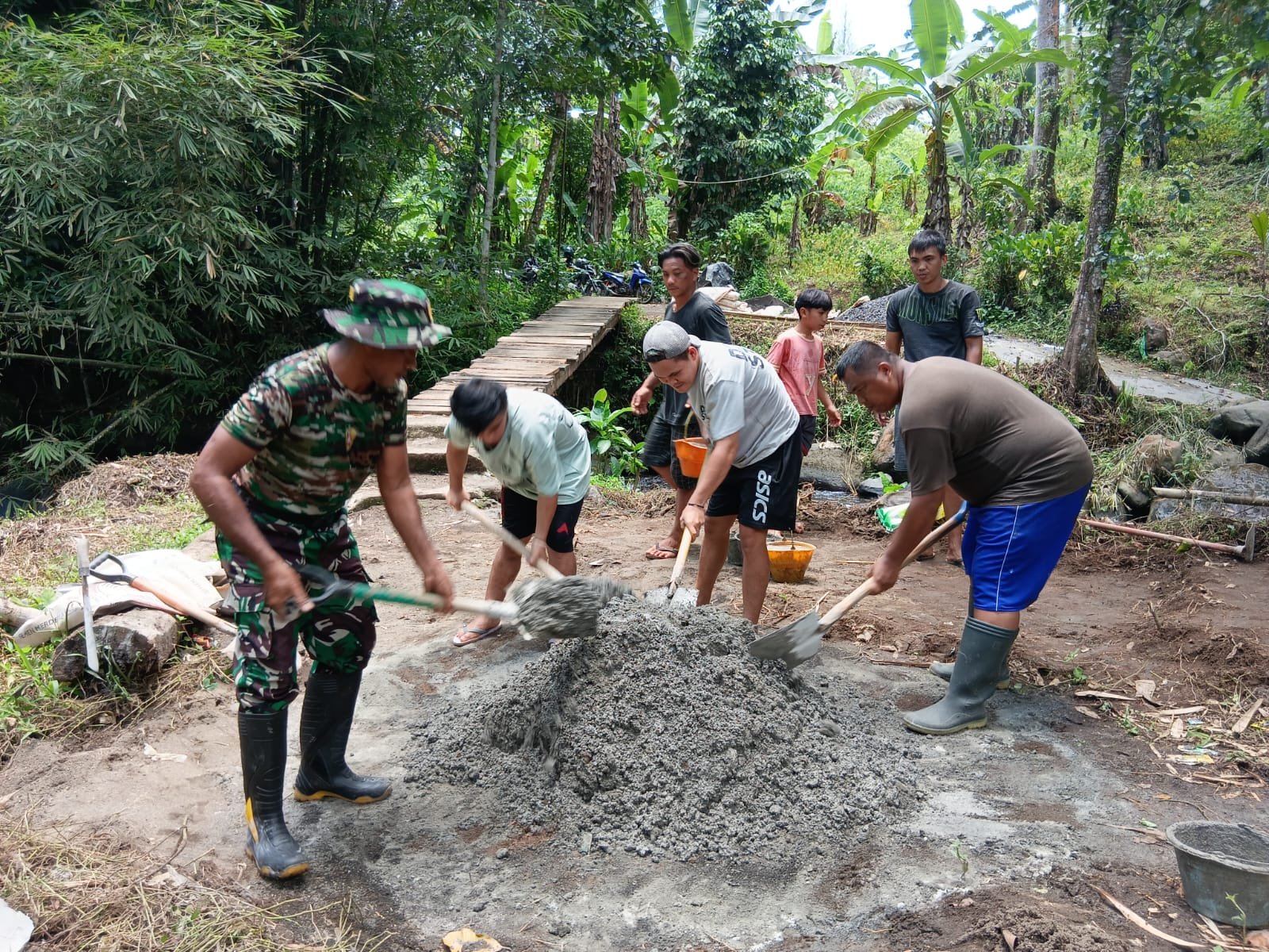 Setelah prosesi peletakan batu, kegiatan dilanjutkan dengan pembangunan jembatan secara gotong royong antara TNI, pemerintah desa, dan warga. Semangat kebersamaan dan kerja sama terlihat jelas dalam setiap tahapan pekerjaan, mencerminkan nilai-nilai kemanunggalan TNI dengan rakyat.