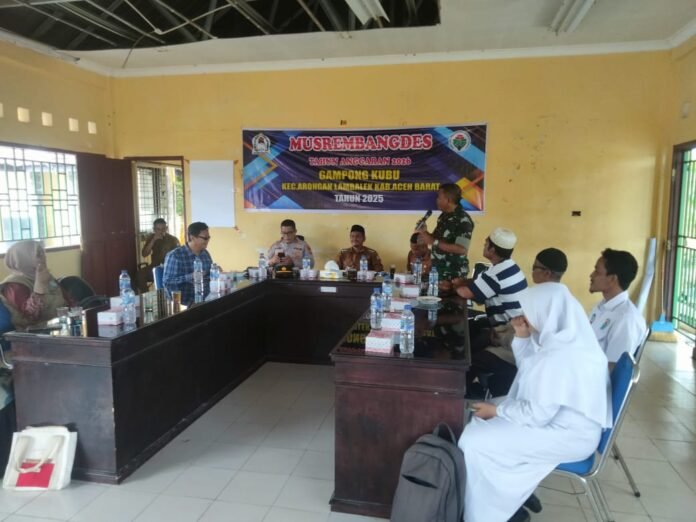 ACEH BARAT – Danramil Arongan Lambalek Kodim 0105/Aceh Barat Kapten Inf Herinizal S.Sos bersama Kapolsek Arongan Lambalek Iptu Ramli menghadiri kegiatan Musyawarah Perencanaan Pembangunan Desa (Musrembangdes) yang berlangsung di Desa Kubu, Kecamatan Arongan Lambalek, Kabupaten Aceh Barat, Rabu (15/10/2025).
