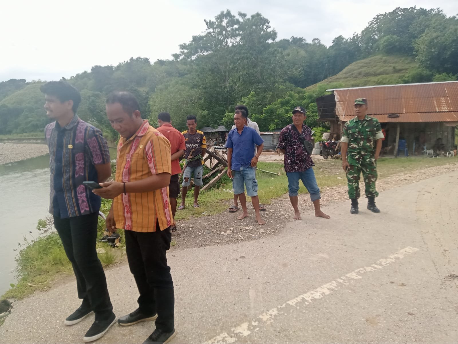 SUMBA BARAT – Danramil 02/Walakaka Kodim 1613/Sumba Barat, Kapten Inf Abdul Manan, bersama petugas dari Dinas Pekerjaan Umum dan Penataan Ruang (PUPR) Kabupaten Sumba Barat melaksanakan pengecekan serta pengukuran lokasi rencana pembangunan jembatan di Desa Taramanu, Kecamatan Wanukaka, Kabupaten Sumba Barat, Kamis (15/01/2025).