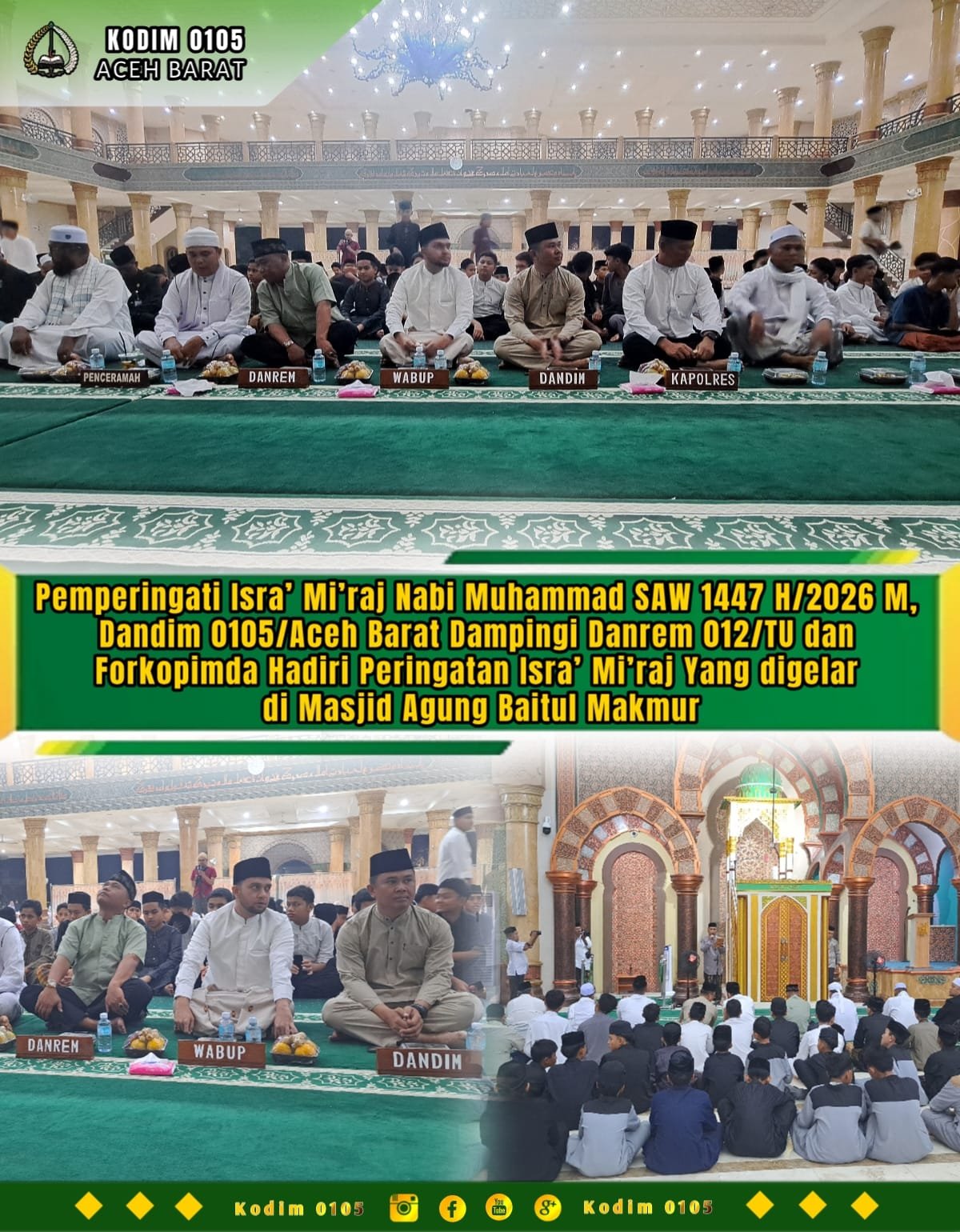 ACEH BARAT — Dalam rangka memperingati peristiwa Isra’ Mi’raj Nabi Muhammad SAW, Danrem 012/TU Kolonel Inf Windarto, S.Sos., M.M., bersama Dandim 0105/Aceh Barat Letkol Inf S. Kembaren, S.E., M.I.P., CFrA., serta unsur Forum Koordinasi Pimpinan Daerah (Forkopimda) Kabupaten Aceh Barat menghadiri kegiatan peringatan Isra’ Mi’raj Nabi Muhammad SAW yang diselenggarakan di Masjid Agung Baitul Makmur, Jalan Imam Bonjol, Desa Seuneubok, Kecamatan Johan Pahlawan, Kabupaten Aceh Barat, Kamis malam (15/01/2026).