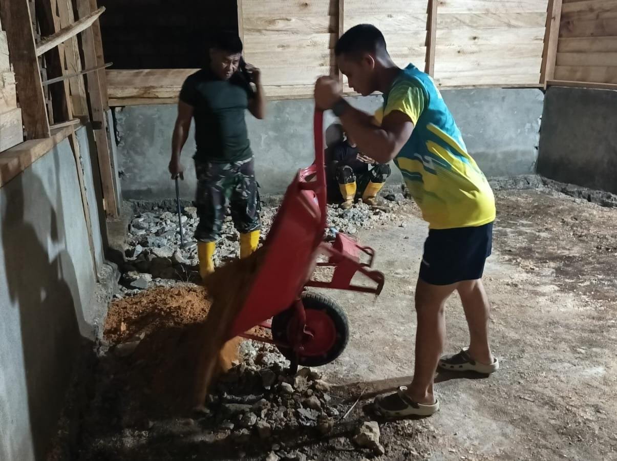 Meski dihadapkan pada keterbatasan penerangan, para prajurit tetap bekerja dengan penuh semangat bersama warga guna merampungkan rehabilitasi Rumah Tidak Layak Huni (RTLH).