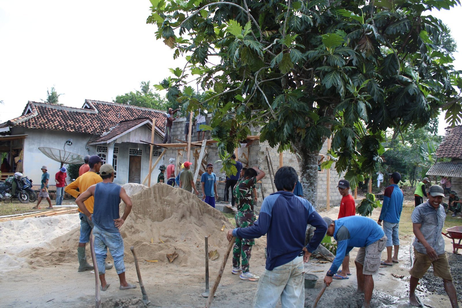 Kegiatan ini dipimpin Peltu Supriyono bersama anggota Satgas TMMD, dengan dukungan penuh warga sekitar. Mereka bahu-membahu membangun rumah, menunjukkan kuatnya semangat gotong royong di Kampung Sriwijaya.