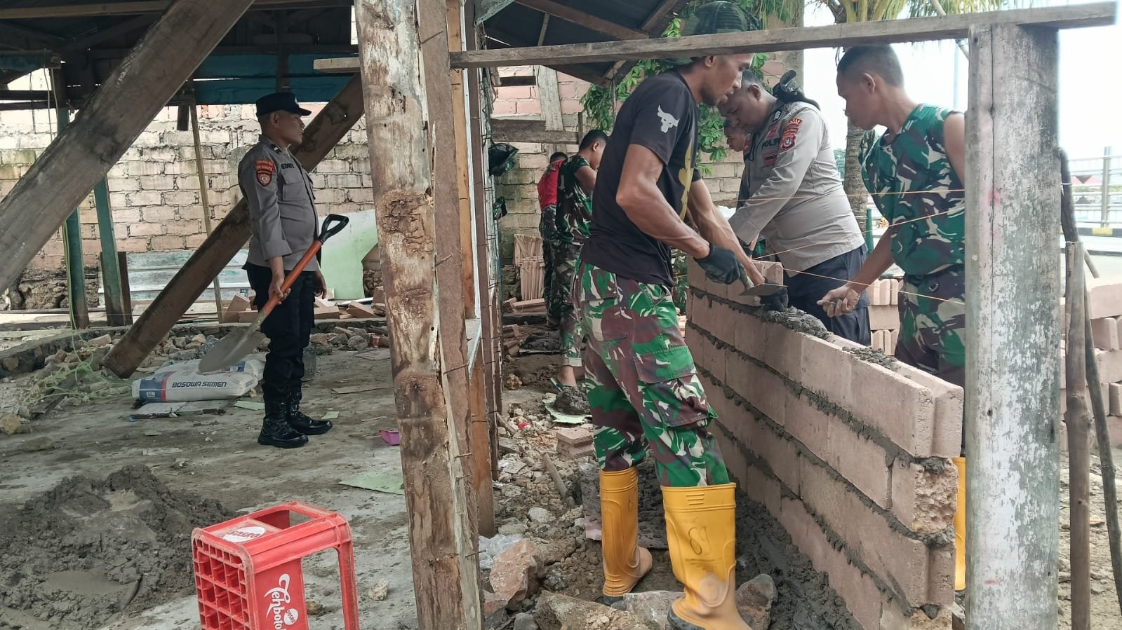 Personel TNI dan Polri bekerja penuh dedikasi membangun dinding rumah secara bertahap dengan memperhatikan kualitas konstruksi.