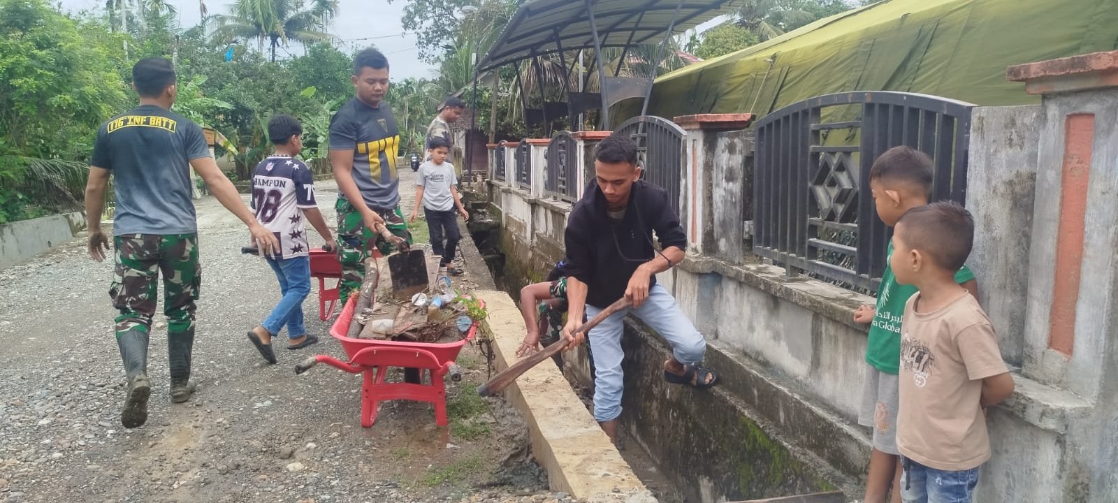 Pernyataan tersebut menjadi semangat bersama dalam pelaksanaan aksi bersih lingkungan. Prajurit dan warga bekerja berdampingan membersihkan parit yang tersumbat sampah.