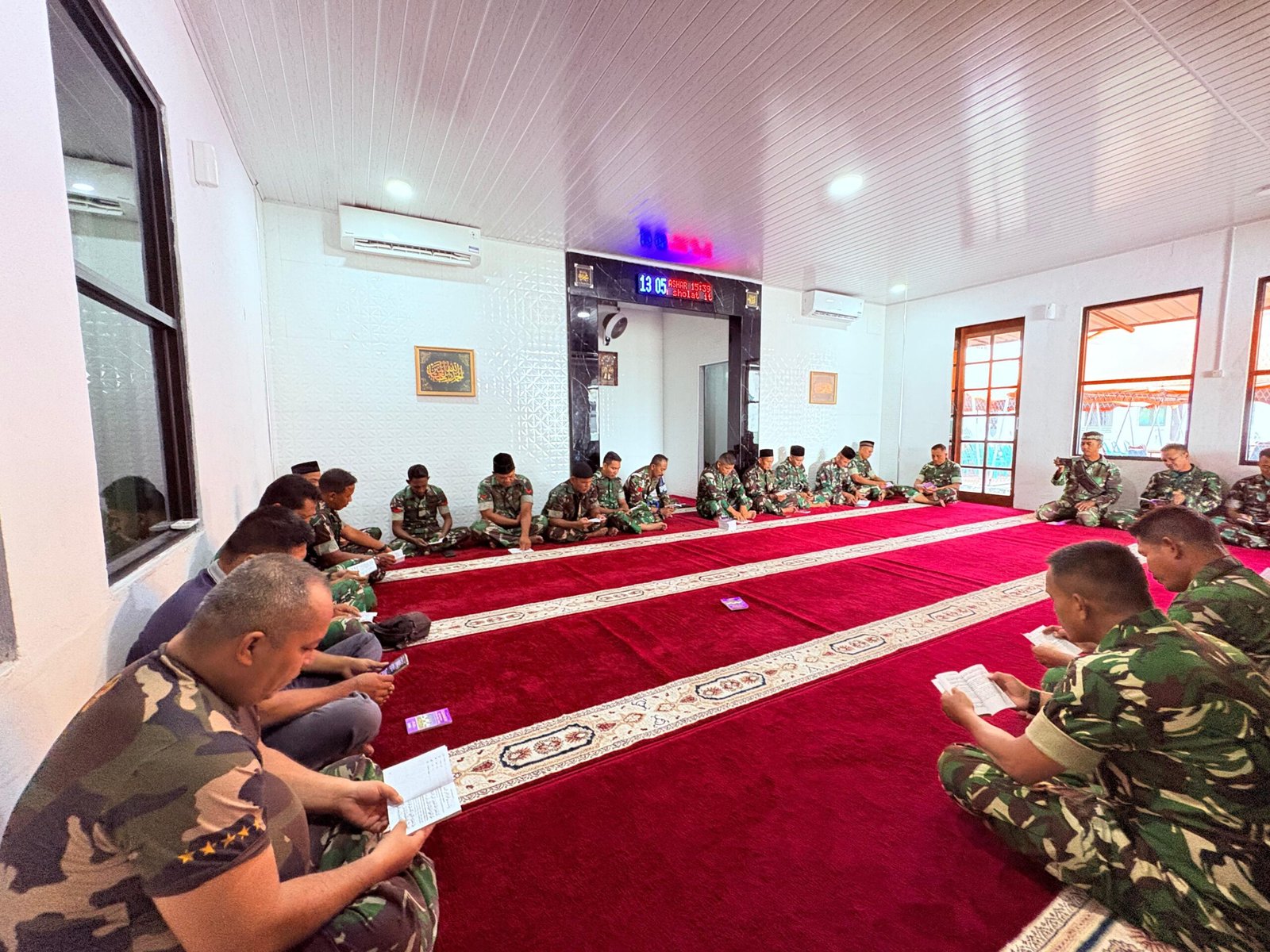 Personil Kodim 0103/Aceh Utara usai pelaksanaan sholat Dzuhur, kegiatan dilanjutkan dengan pembacaan Surah Yasin dan doa bersama yang dipanjatkan secara khusyuk untuk almarhum. Suasana hening terasa, setiap prajurit larut dalam doa sebagai bentuk penghormatan terakhir kepada rekan seperjuangan.