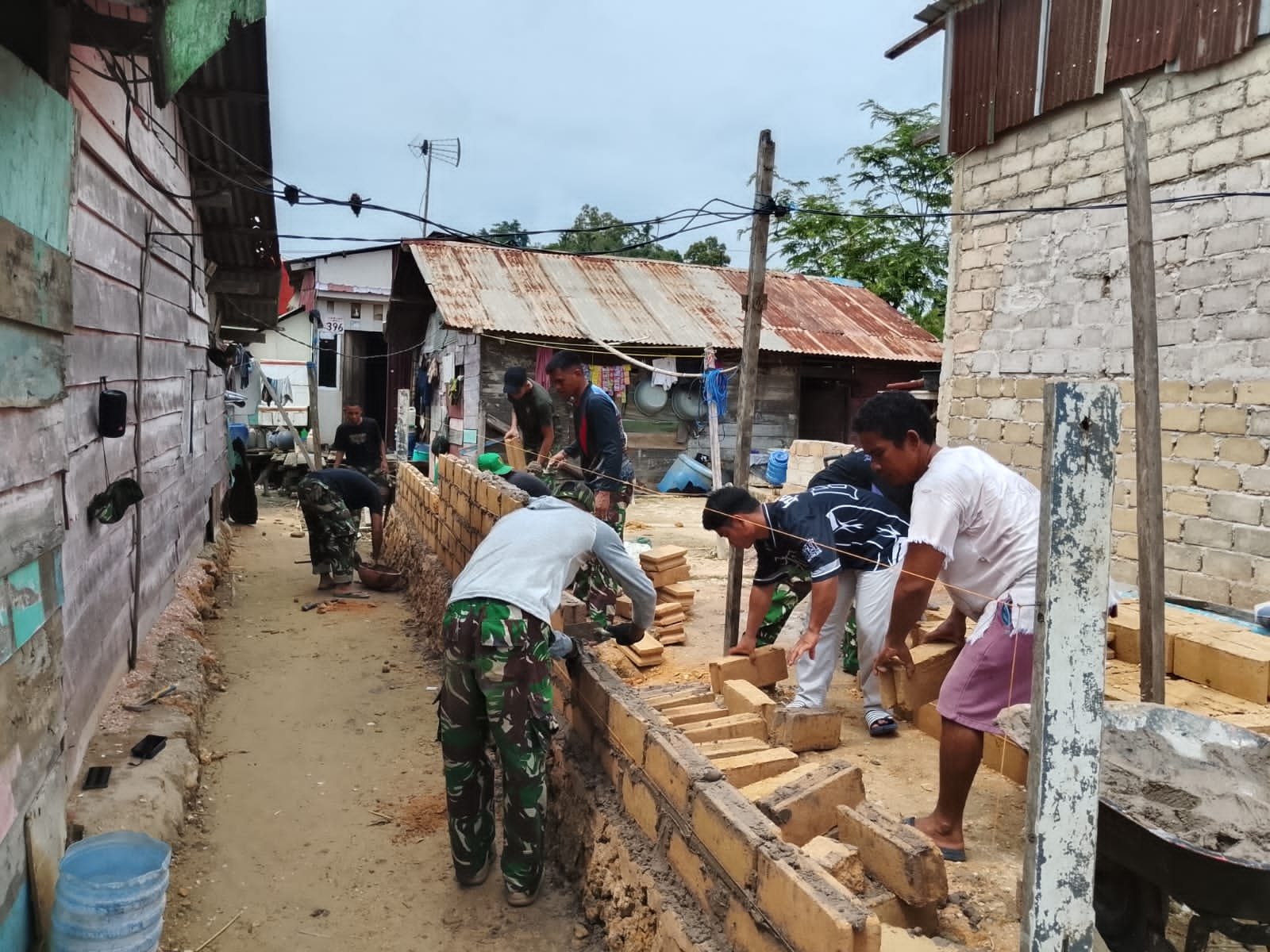 Personel Satgas bersama warga tampak kompak melanjutkan pemasangan dinding batako sebagai bagian penting dalam proses rehabilitasi rumah. Tahapan ini menjadi fondasi utama untuk menciptakan hunian yang lebih aman dan sehat bagi keluarga penerima manfaat.