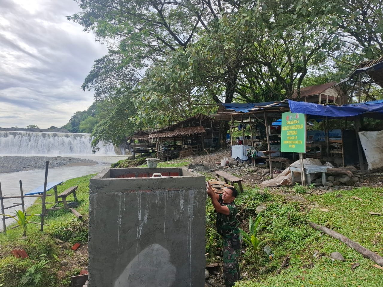 Di bawah sinar mentari Sabtu (28/2/2026), anggota Satgas TMMD tampak sibuk merapikan plester dinding bak, seolah menguatkan fondasi harapan warga.