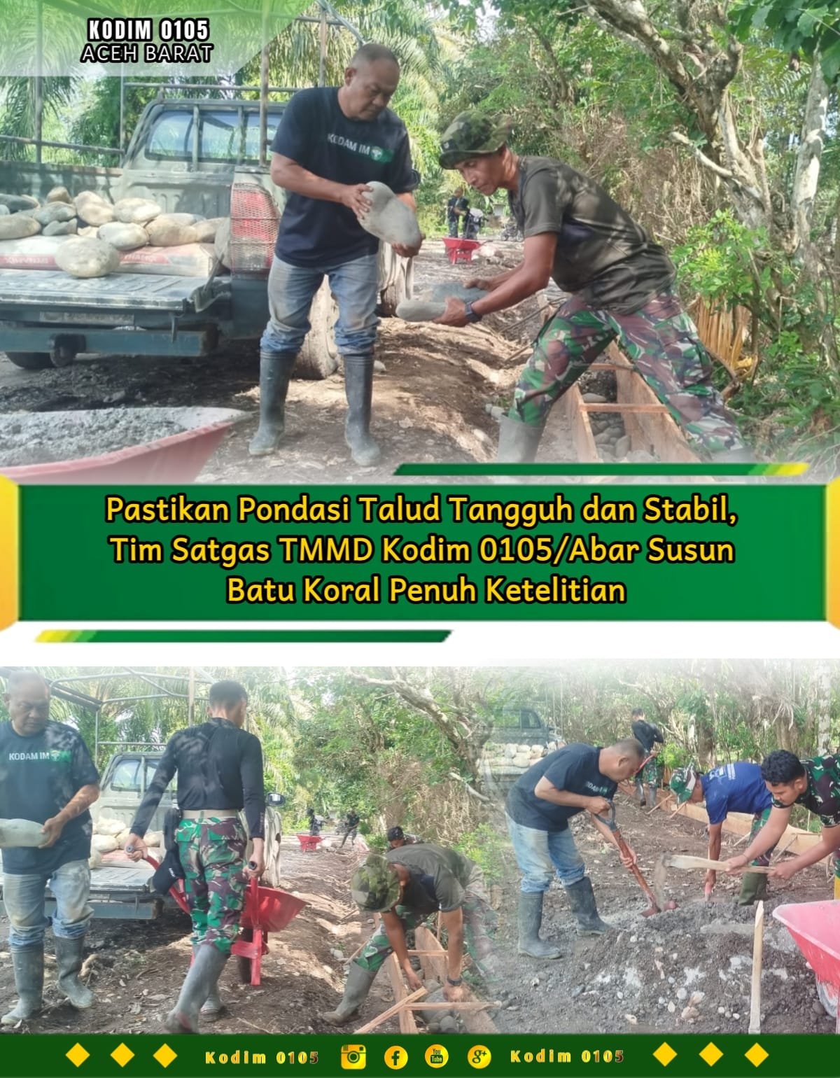 Aceh Barat – Di bawah panas matahari, personel Satgas TMMD Reguler ke-127 Kodim 0105/Abar bersama warga dengan penuh ketekunan menyusun batu koral sebagai pondasi Talud Penahan Timbunan di Desa Pasi Aceh, Kecamatan Woyla, Senin (23/2/2026).