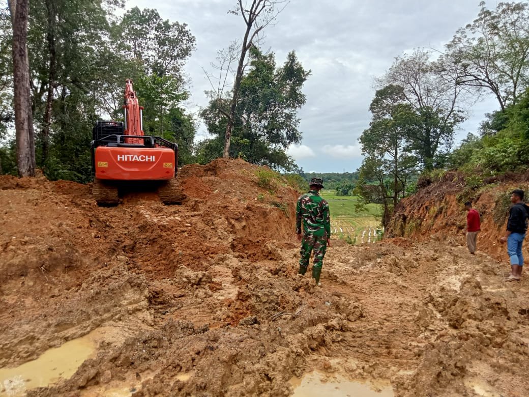 Pengerjaan badan jalan sepanjang 3.100 meter dengan lebar 6 meter yang berlokasi di Desa Ujong Blang tetap berlangsung walaupun sejumlah titik pekerjaan tergenang air akibat hujan. Kegiatan di lapangan tetap berjalan dengan dukungan alat berat excavator dan kerja sama anggota Satgas TMMD, Rabu (18/2/2026).