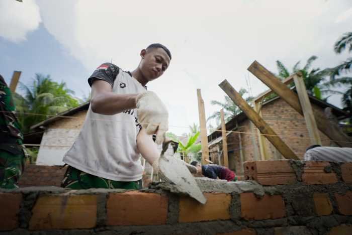 Keringat yang mengalir menjadi bukti nyata dedikasi para prajurit. Mereka bekerja tanpa mengenal lelah, memastikan setiap susunan bata terpasang kuat demi menghadirkan hunian yang aman dan layak bagi masyarakat.