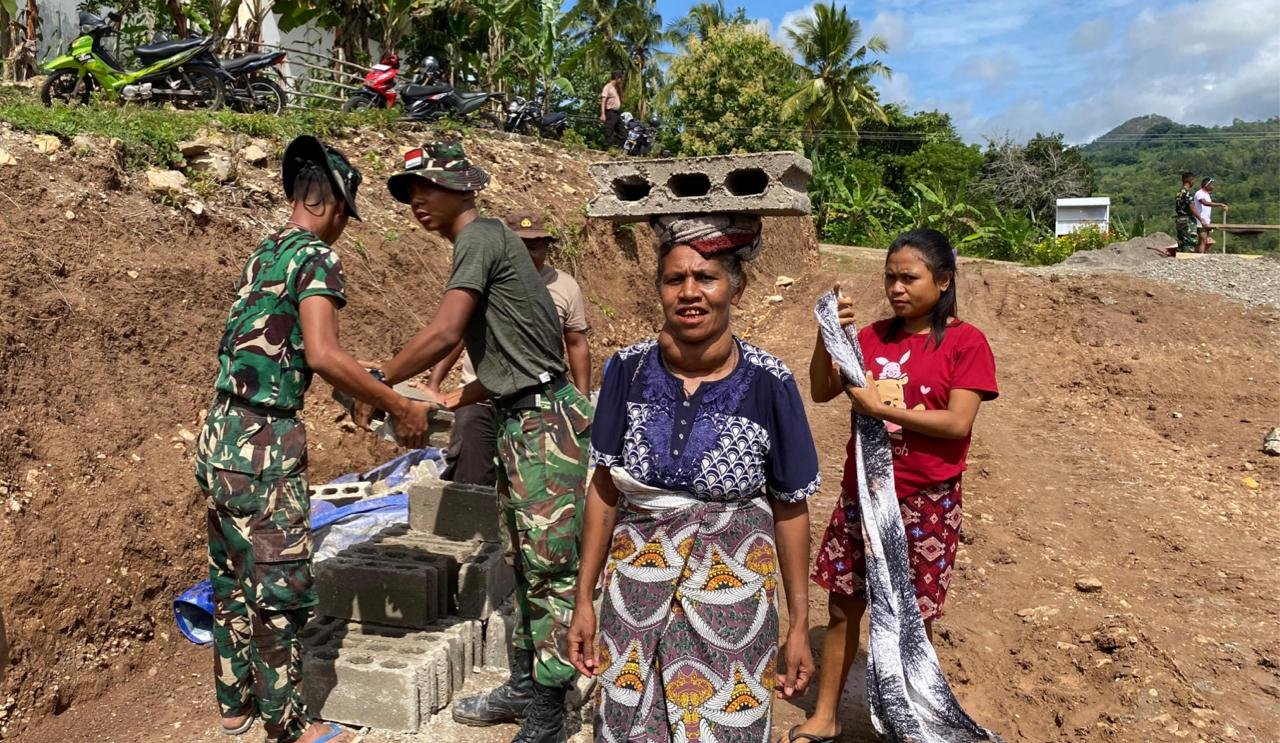 Menariknya, bukan hanya kaum bapak yang terlibat. Ibu-ibu Desa Sunkaen turut ambil bagian dengan penuh antusias, membaur bersama personel TNI demi mempercepat penyelesaian pembangunan ruang belajar bagi anak-anak mereka.