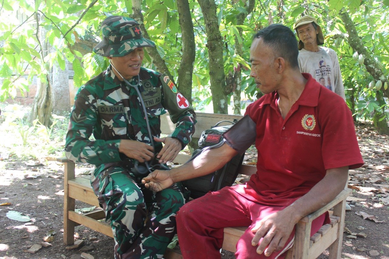 Sambil tersenyum ramah, Serda Darma memeriksa tekanan darah warga satu per satu, menanyakan keluhan ringan, dan memberi saran agar tidak bekerja terlalu berat di bawah terik matahari. Bagi warga, kehadiran sosok prajurit yang peduli ini terasa menenangkan.