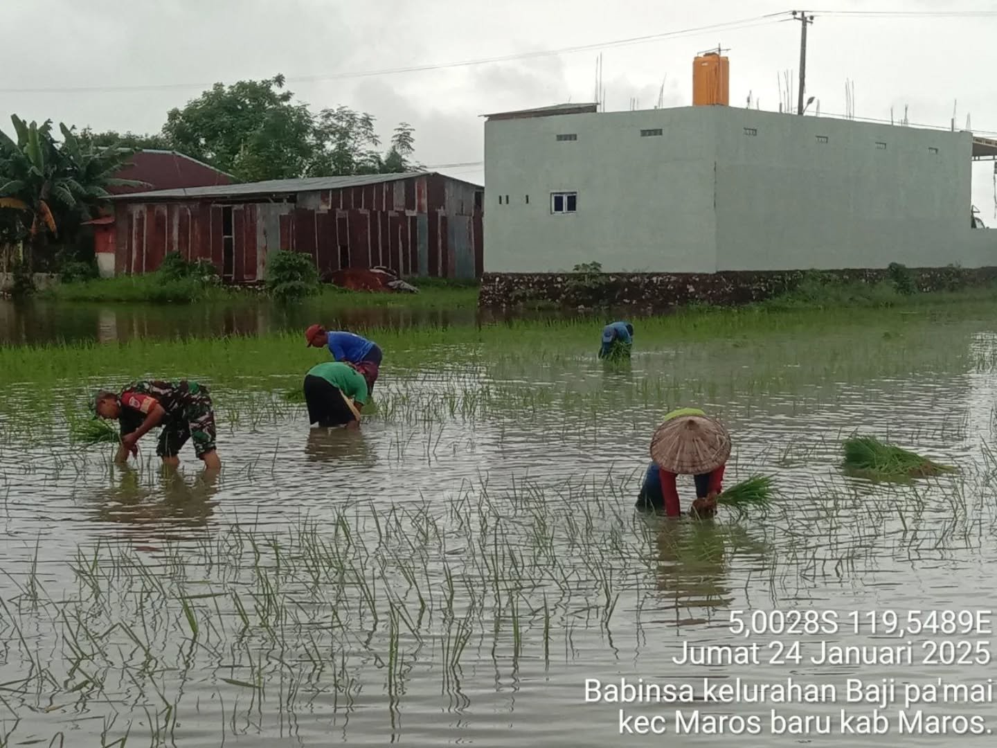 Maros – Dalam rangka mendukung program ketahanan pangan, Babinsa Kel. Bajipamai Serma Muh. Arif turun langsung ke sawah untuk membantu petani menanam padi di Kel. Bajubodoa, Kecamatan Maros Baru, Kabupaten Maros, pada Jumat (24/01/2025).