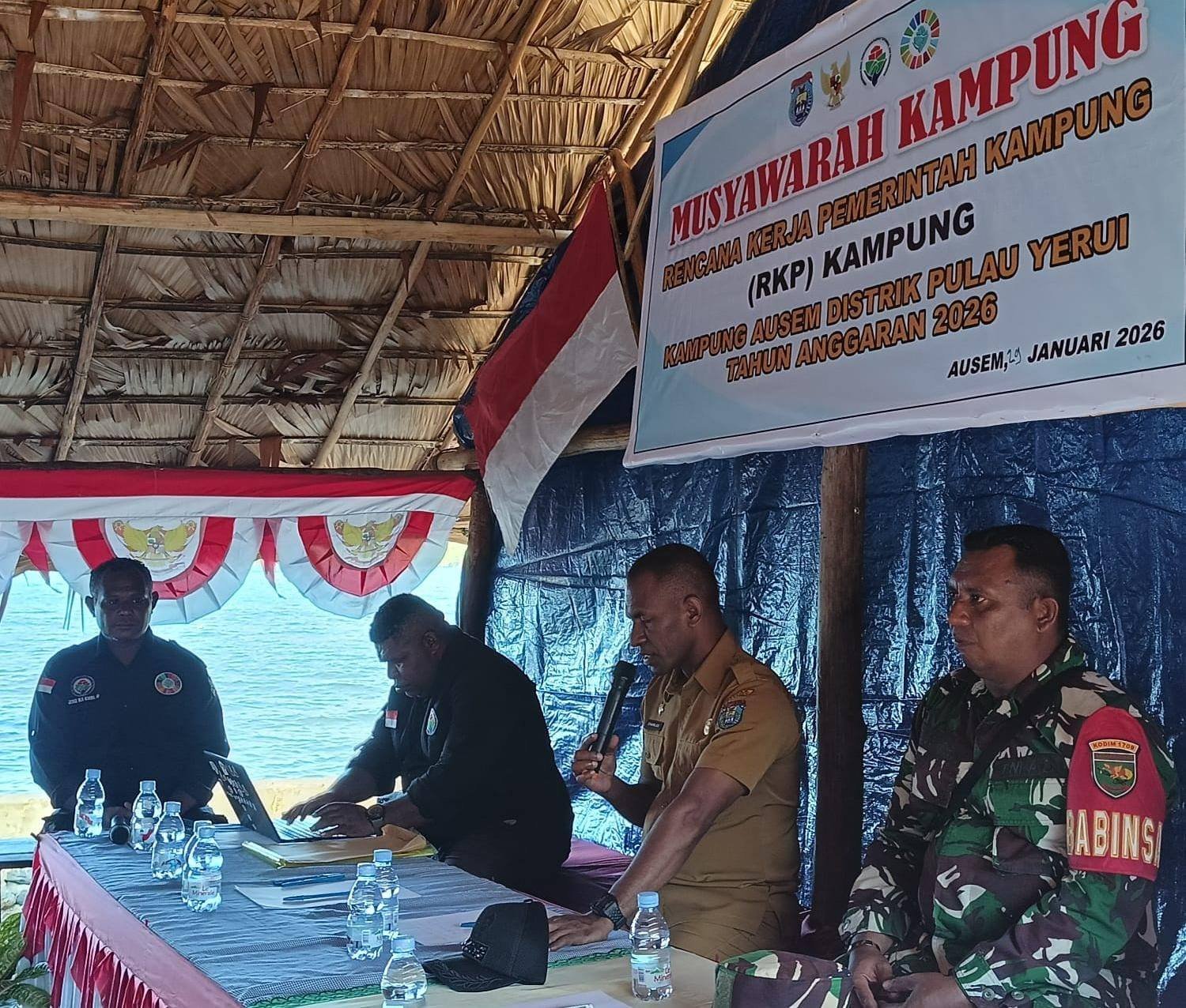 Yapen – Dalam rangka mendukung perencanaan pembangunan kampung yang partisipatif dan berkelanjutan, Sertu Engel Dumatubun selaku Babinsa Koramil 1709-04/Ansus menghadiri kegiatan Musyawarah Kampung Rencana Kerja Pemerintah Kampung (RKP) Kampung Ausem Tahun Anggaran 2026, yang dilaksanakan di Kampung Ausem, Distrik Pulau Yerui, Kabupaten Kepulauan Yapen.Rabu(04/02/2026).
