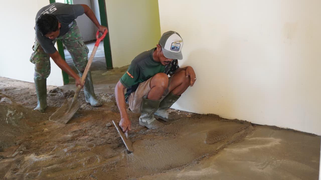 Anggota Satgas TMMD tampak bekerja penuh kehati-hatian saat meratakan adukan semen ke seluruh bagian lantai. Setiap sudut diperhatikan agar tidak ada permukaan yang bergelombang, sehingga kualitas bangunan tetap terjaga.