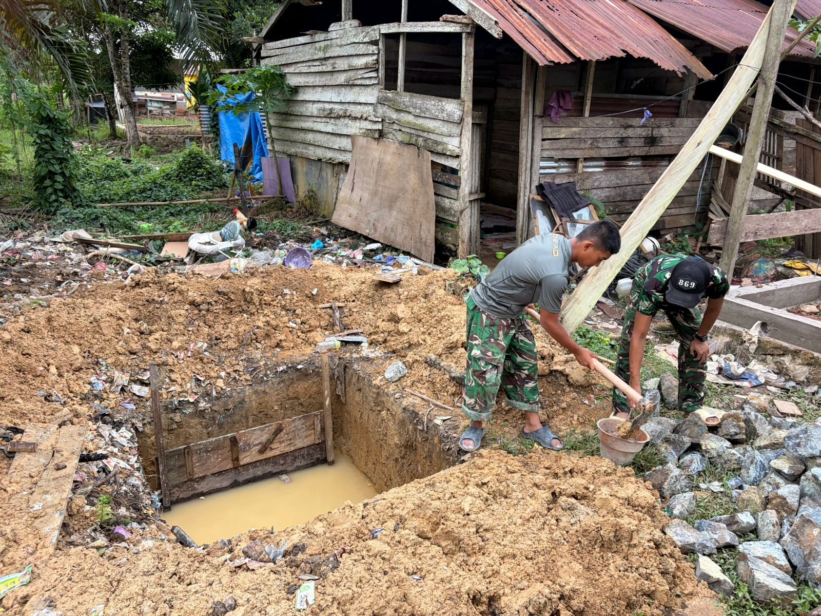 Dengan peralatan sederhana dan tekad yang kuat, anggota Satgas bahu-membahu menggali tanah sebagai langkah awal pembangunan fasilitas MCK yang layak. Canda tawa di sela pekerjaan menjadi bukti bahwa kedekatan antara TNI dan masyarakat bukan sekadar slogan, melainkan nyata di lapangan.