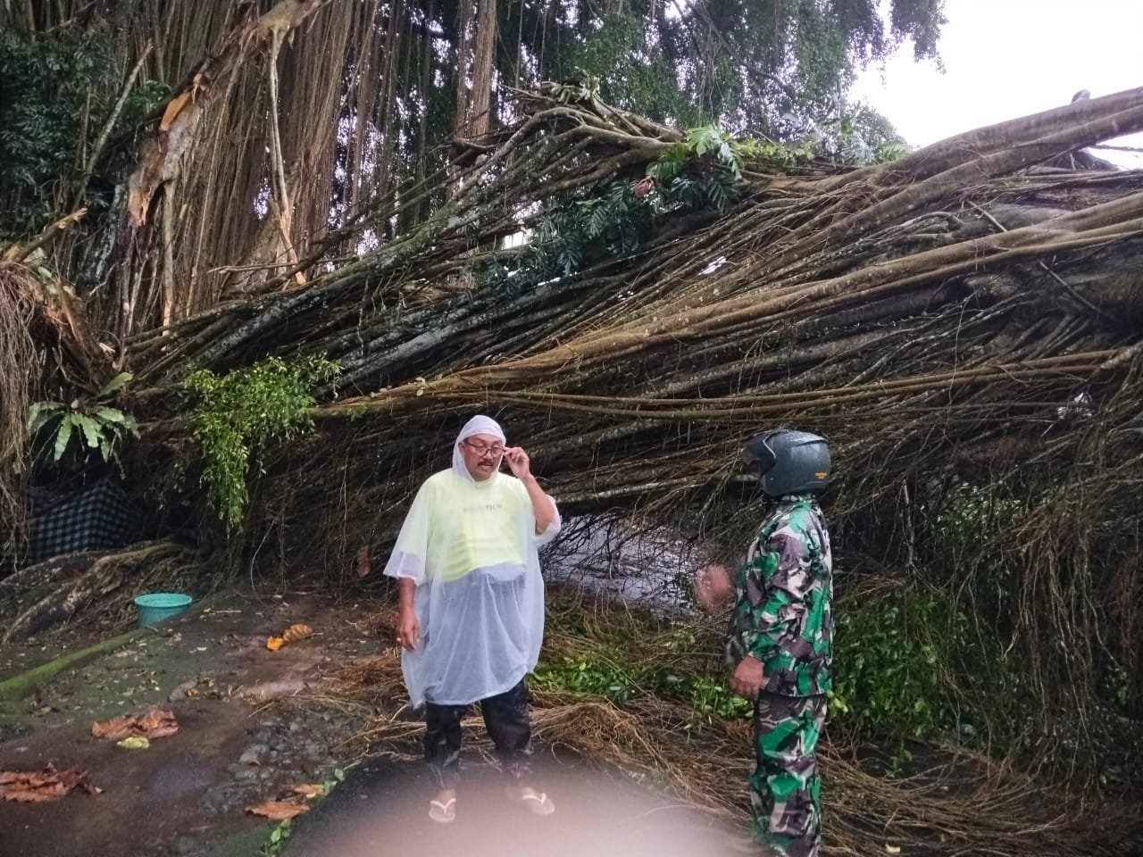 Musibah pohon beringin tumbang ini terjadi sekira pukul 17.30 Wita. Pohon beringin yang memiliki ukuran besar ini tumbang ke jalan, sehingga akses lumpuh total, “ucap Serma Wayan.