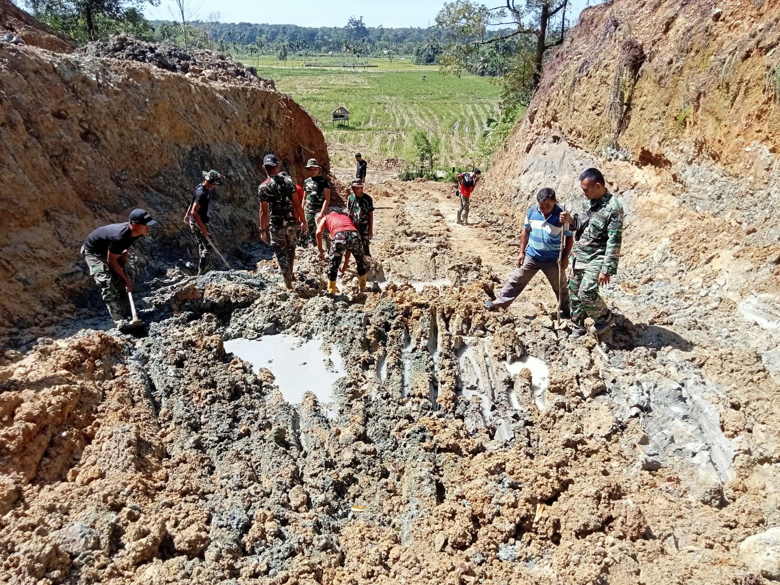 Kerja dilakukan tanpa banyak menunggu. Setiap ayunan alat menjadi langkah kecil yang menjaga jalan tetap berfungsi sebagai penghubung aktivitas warga desa. Kebersamaan antara prajurit dan masyarakat terlihat jelas, menghadirkan suasana kerja yang ringan meski medan cukup berat.