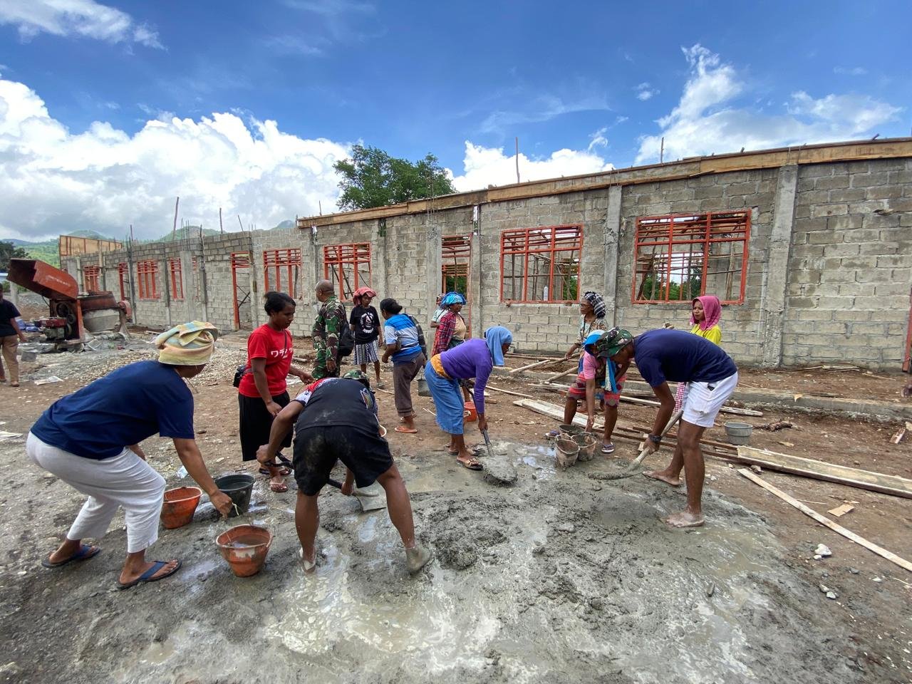 Pemandangan penuh inspirasi tampak di lokasi. Ibu-ibu dengan penuh ketulusan membantu mengangkat campuran semen, sementara para bapak sigap melakukan pengecoran di bagian atas bangunan. Tanpa sekat, tanpa perbedaan, semua menyatu demi satu tujuan mulia.