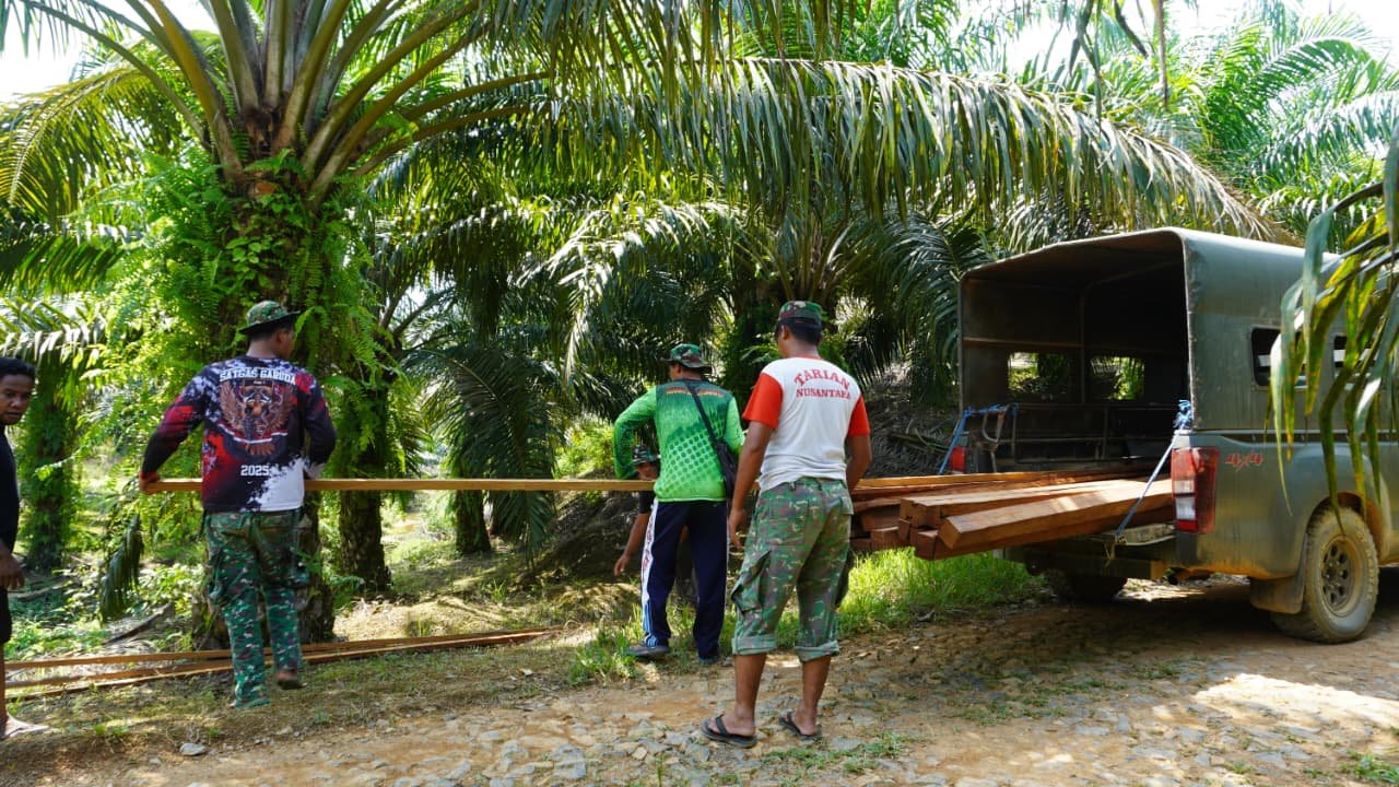 Kotawaringin Timur – Proses pembongkaran material kayu ulin untuk pembangunan jembatan TMMD ke-127 berlangsung lancar berkat kerja sama antara Satgas dan warga setempat, Rabu (04/03/2026).