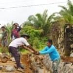 Personel Satgas bersama masyarakat setempat bekerja sama membongkar bagian bangunan lama, lalu membangun kembali dengan material yang lebih kuat dan tahan lama.