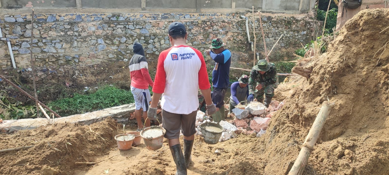 Sejak pagi hari, prajurit TNI bersama warga terlihat saling bahu-membahu mengolah material bangunan, mulai dari pencampuran semen hingga pengangkutan bahan konstruksi menuju lokasi pengerjaan.