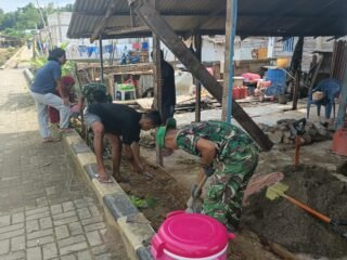 Meski berada di bulan suci Ramadhan, personel Satgas bersama masyarakat tetap konsisten menyelesaikan pembangunan infrastruktur desa. Pekerjaan pengecoran talud dilakukan secara gotong royong guna memperkuat badan jalan serta mencegah terjadinya longsor dan erosi.