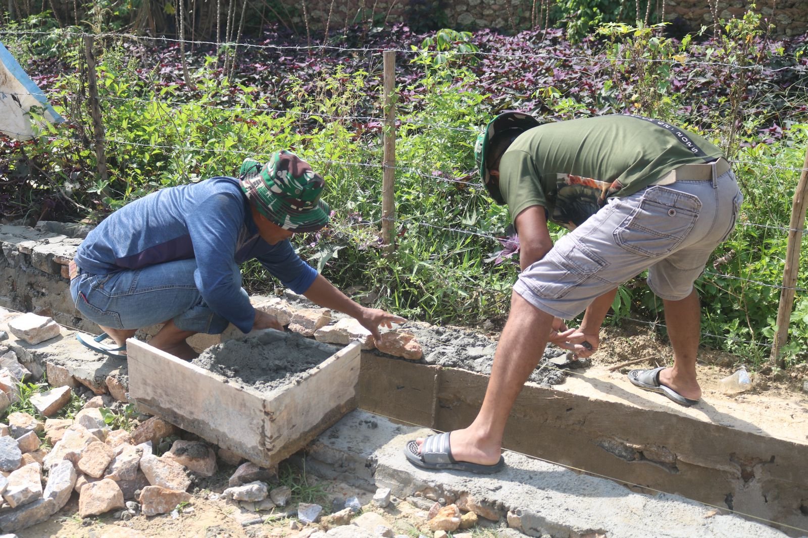 Antusiasme warga tampak jelas saat mereka turut membantu personel Satgas dalam proses penyusunan batu dan pengadukan semen untuk mempercepat penyelesaian pembangunan.