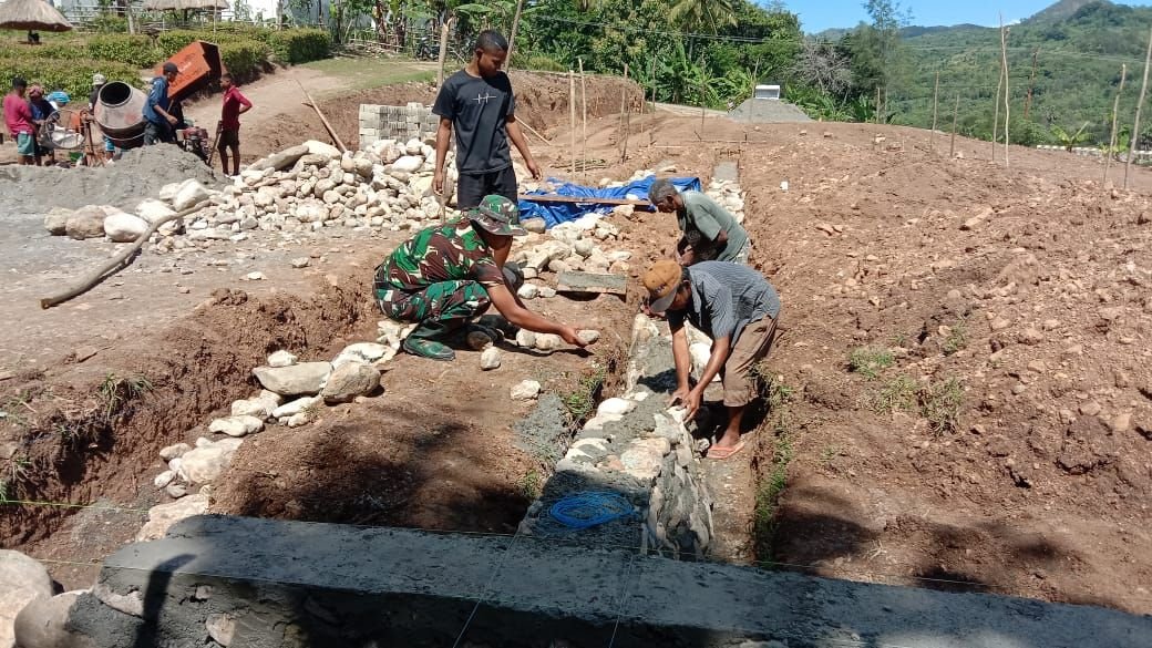 Babinsa Koramil setempat, Serka Lamberto Da Costa., terpantau turun langsung ke lokasi bersama warga. Bahu-membahu, mereka mengerjakan pondasi bangunan dengan penuh semangat dan kekompakan, meskipun berada di wilayah dengan kondisi geografis yang cukup menantang.