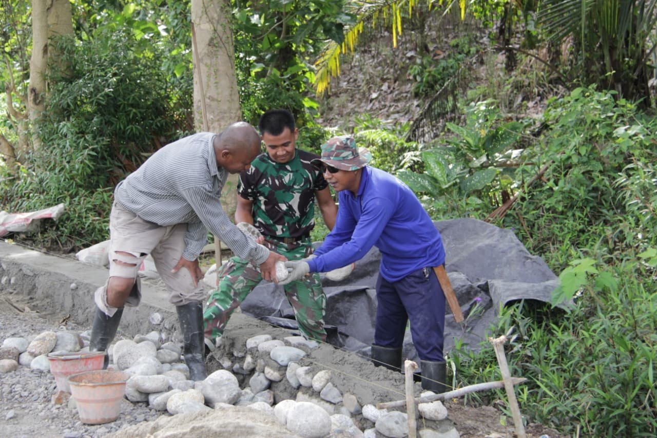Anggota Satgas TMMD dari Kodim 1305/BT bersama warga setempat bahu-membahu melaksanakan pengerasan jalan sepanjang 650 meter dengan lebar 4 meter. Selain itu, pembangunan talud sepanjang 1.030 meter juga terus dikebut guna menunjang infrastruktur dan mencegah terjadinya longsor di sekitar badan jalan.