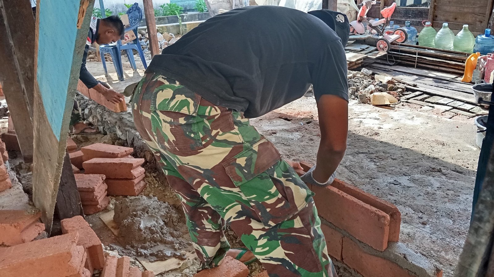 Pada tahap pemasangan batu bata, personel TNI bersama warga saling bahu-membahu menyusun material bangunan dengan penuh semangat. Suasana kerja yang kompak mencerminkan kuatnya kemanunggalan TNI dan rakyat dalam membangun lingkungan yang lebih baik.