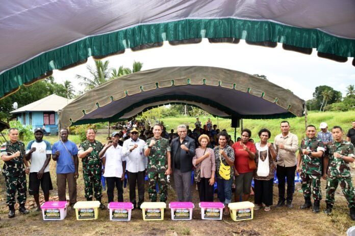 Nampak hadir para pejabat Kodam XXIV/Mandala Trikora, Danrem 174/ATW Brigjen TNI Mustakim, S.I.P., M.Si., Kasi Keterpaduan Pembangunan BWS Papu Selatan Quentino Elgar dan Kepala Kampung Chandra Jaya Bapak Aris.