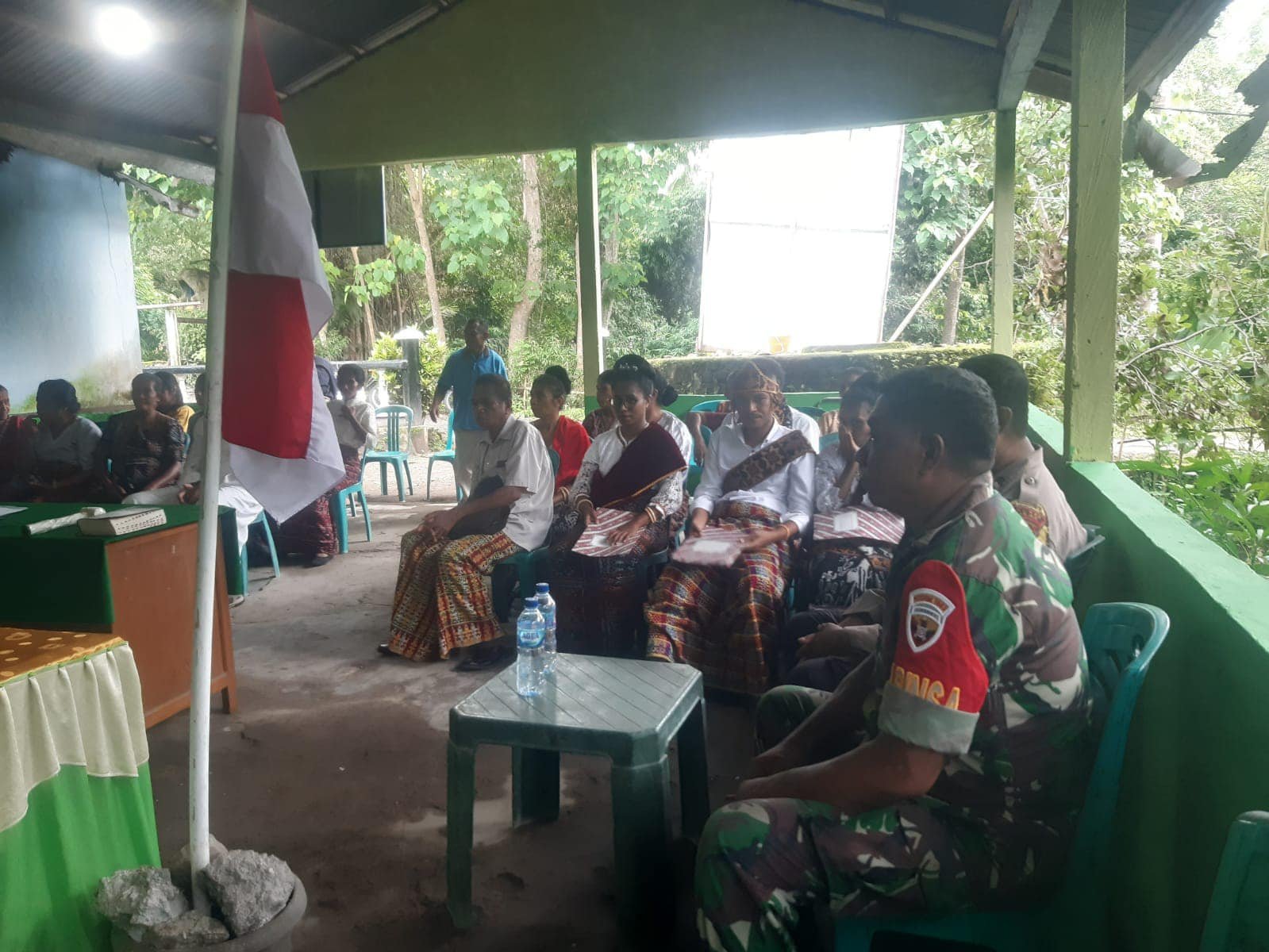 NTT-SIKKA. Babinsa Koramil 1603-04/Kewapante Sertu Muhammad Nur menghadiri pelantikan dan pengambilan sumpah jabatan perangkat desa yang lama ke perangkat desa yang baru, bertempat di di aula kantor Desa Teka Iku kec. Kangae, Kab. Sikka, Sabtu(08/02/2025).