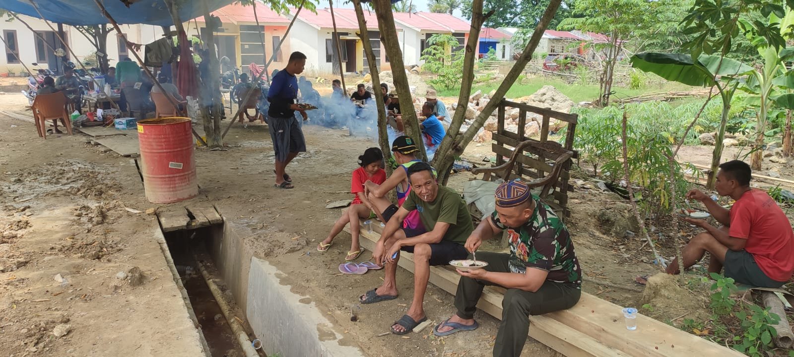 Personel TNI dan warga tampak menikmati hidangan secara sederhana dengan penuh keakraban. Canda dan obrolan ringan menghiasi suasana, mencerminkan hubungan yang harmonis antara aparat dan masyarakat setempat.