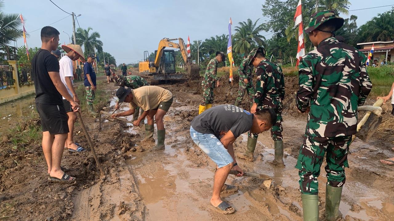 Kabupaten Banyuasin, memasuki hari ke-7 pelaksanaan program TMMD ke-127, anggota Satgas TMMD 127 Kodim 0430/BA bersama masyarakat terus menunjukkan semangat gotong royong dalam kegiatan fisik pembukaan badan jalan penghubung dari Desa Wonosari menuju Desa Rukun Makmur, 17/2/2026.