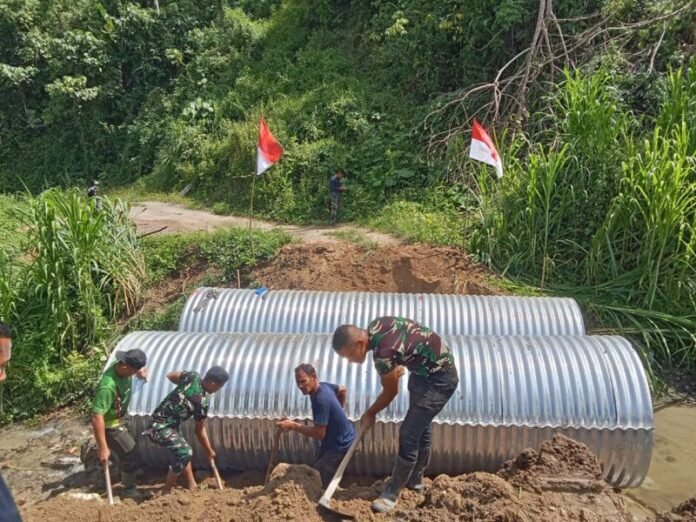 Terlihat jelas kekompakan yang diciptakan TNI bersama warga dalam pembangunan jembatan Aramco guna mempercepat proses pengerjaan. Hal ini menjadi bukti nyata bahwa TNI selalu hadir bersama rakyat.