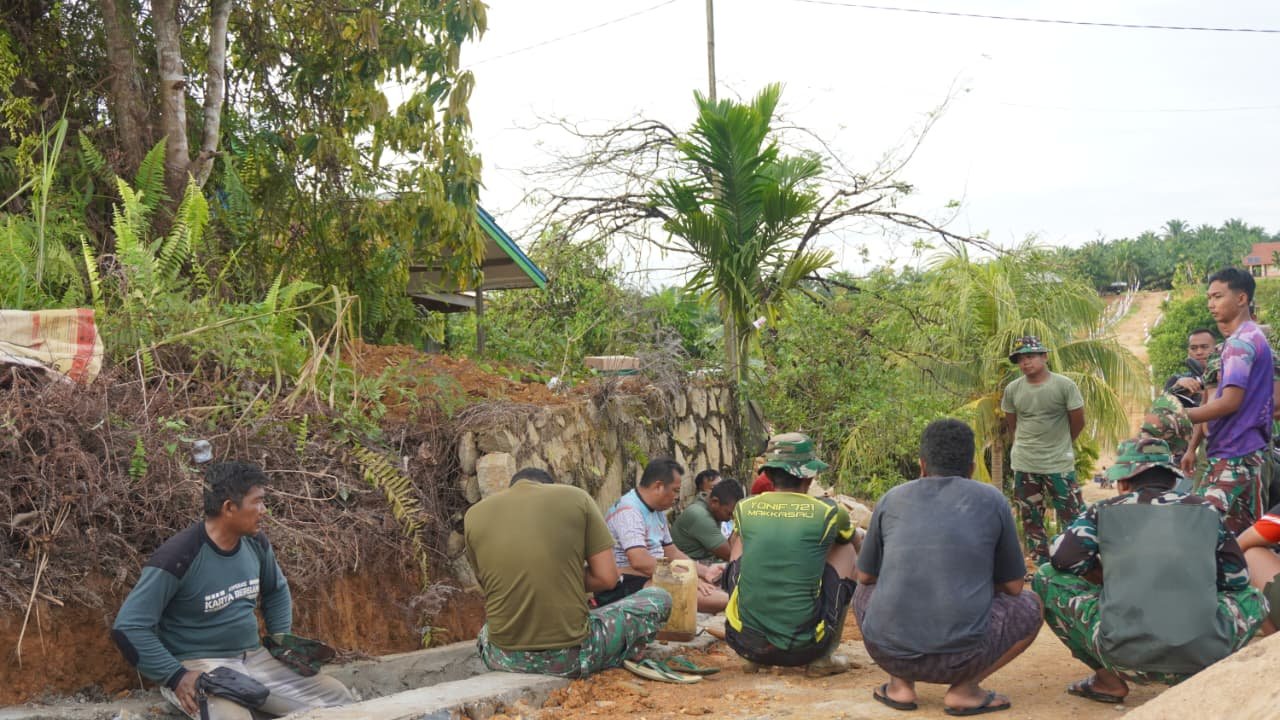 Kotawaringin Timur – Pelaksanaan TMMD ke-127 di Desa Tri Buana tak hanya menghadirkan pembangunan fisik, tetapi juga memperkuat hubungan sosial. Personel Satgas TMMD Reguler ke-127 Kodim 1015/Sampit memanfaatkan waktu istirahat dengan berbincang santai bersama warga di lokasi pembangunan siring badan jalan, Jumat (20/03/2026).