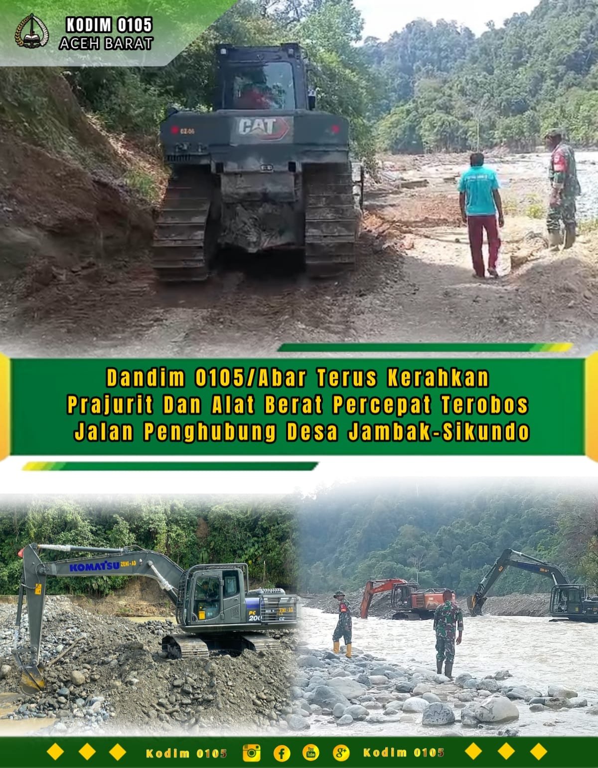 Pembukaan dan terobosan jalan ini merupakan sasaran fisik utama pascaterjangan banjir bandang. Dalam proses pengerjaannya, kegiatan ini cukup menguras tenaga, namun tidak serta-merta menyurutkan semangat prajurit. Ditambah lagi, Dandim 0105/Abar Letkol Inf S. Kembaren, S.E., M.I.P., CFrA., setiap hari mengerahkan alat berat untuk mendukung percepatan pekerjaan.
