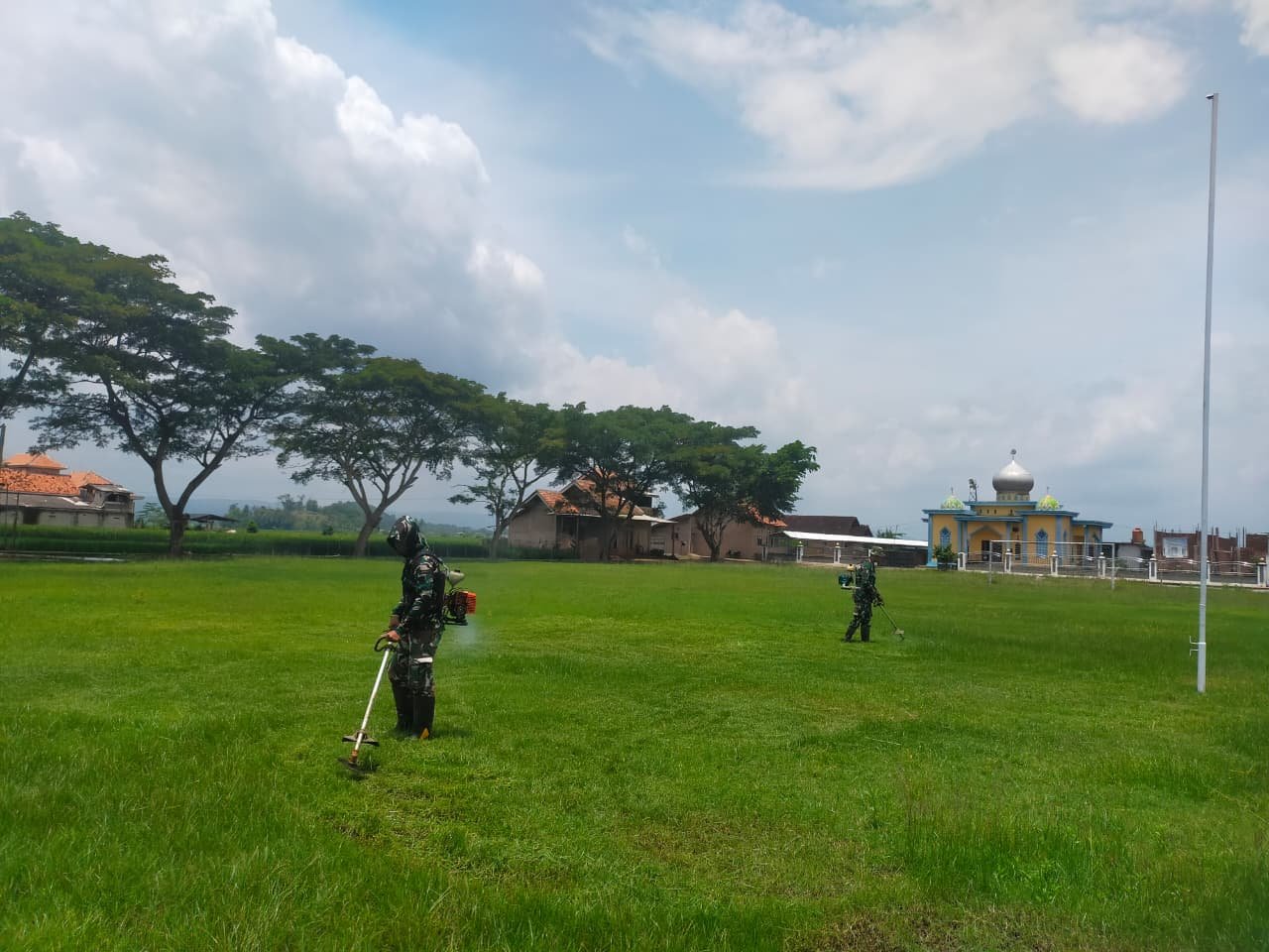 Sejak pagi hari, personel Satgas TMMD terlihat bergotong royong membersihkan area lapangan dengan memotong dan mencabut rumput liar yang tumbuh di sekitar lokasi. Kegiatan tersebut dilakukan agar lapangan tampak rapi, bersih, dan siap digunakan untuk pelaksanaan upacara penutupan TMMD.