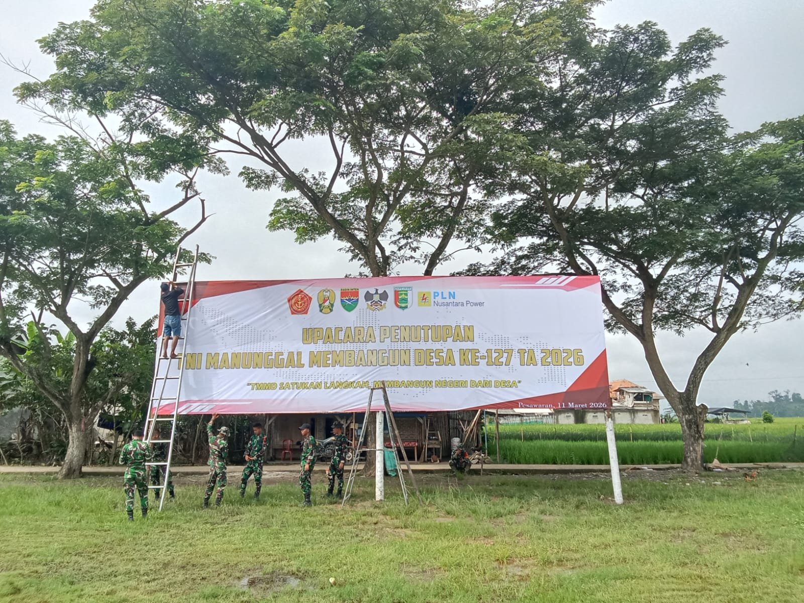 Personel Satgas TMMD ke-127 bersama anggota lainnya terlihat sibuk memasang banner di beberapa titik strategis di sekitar lokasi kegiatan. Banner tersebut dipasang sebagai penanda sekaligus untuk menyemarakkan rangkaian kegiatan penutupan TMMD yang akan segera dilaksanakan.