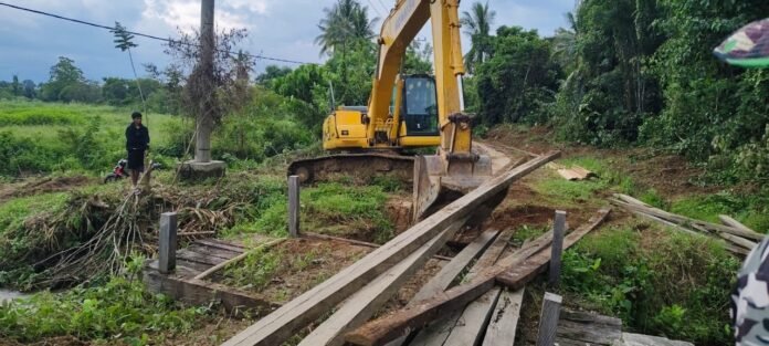 Bombana – Satuan Tugas (Satgas) TNI Manunggal Membangun Desa (TMMD) Reguler ke-124 Kodim 1431/Bombana memulai pembongkaran jembatan lama yang menghubungkan antar dusun di Desa Morengke, Kecamatan Matausu, Kabupaten Bombana, Sabtu (10/5/2025). Proses pembongkaran dilakukan dengan menggunakan alat berat dan disertai pembangunan jalur alternatif untuk menjamin kelancaran mobilitas warga selama pengerjaan berlangsung.