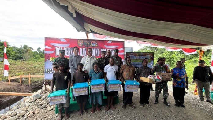 Tidak hanya fokus pada pembangunan fisik, dalam rangkaian kegiatan tersebut Kodim 1705/Nabire juga melaksanakan aksi sosial berupa pembagian sembako dan alat olahraga kepada masyarakat sebagai bentuk kepedulian terhadap kebutuhan warga.