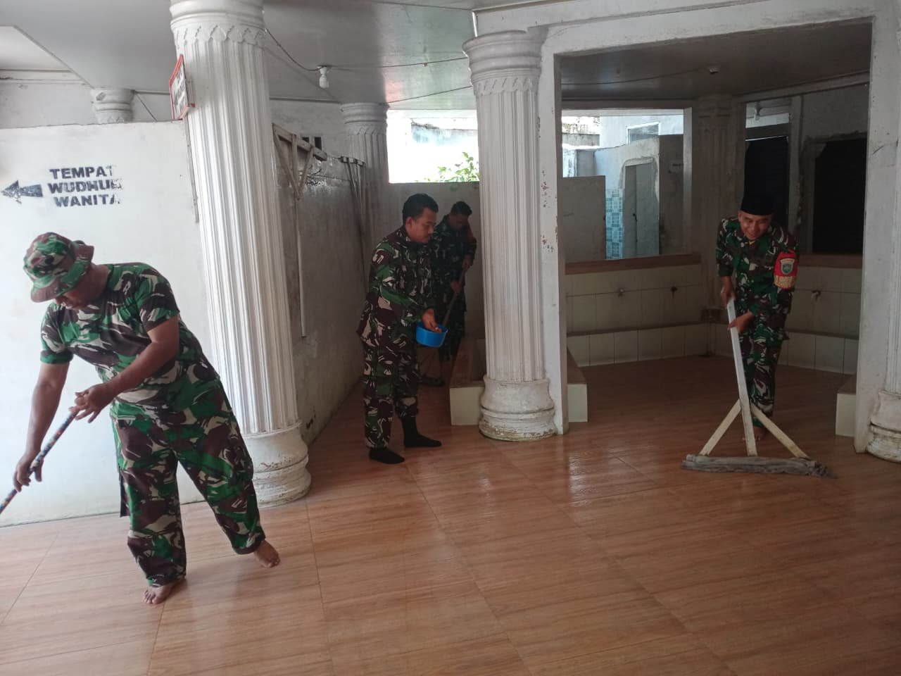 Saat melaksanakan pembersihan, para Prajurit dan Pengurus Masjid serta warga sekitar tampak sangat akrab, kompak dan harmonis saling bahu membahu melakukan aksi pembersihan yang difokuskan membersihkan lantai, ambal/sajadah, mimbar dan areal tempat wudhu guna menyiapkan ibadah sholat Jum’at.