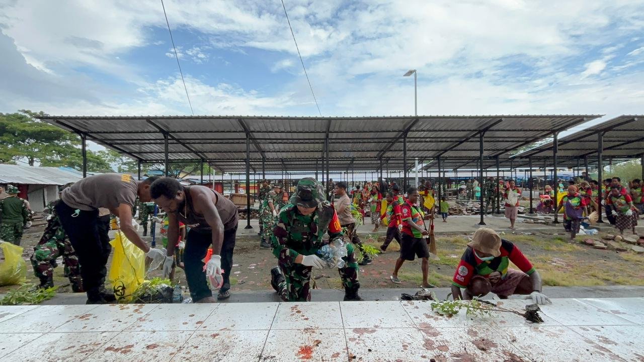 Nabire ~ Dalam upaya menciptakan lingkungan yang bersih, sehat, dan nyaman, anggota Kodim 1705/Nabire bersinergi bersama Polri, Pemerintah Daerah Kabupaten Nabire, serta instansi terkait melaksanakan kegiatan Jumat Bersih di kawasan Pasar Mama-Mama Papua Sayang, di Kelurahan Oyehe, Kabupaten Nabire Provinsi Papua Tengah. Jumat 30 Januari 2026.